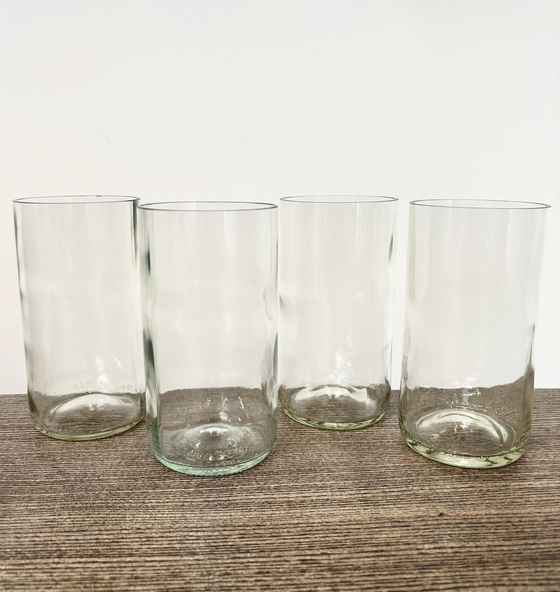 Clear glass tumblers. Handcrafted from wine bottles that have been collected and upcycled in Suffolk, UK.