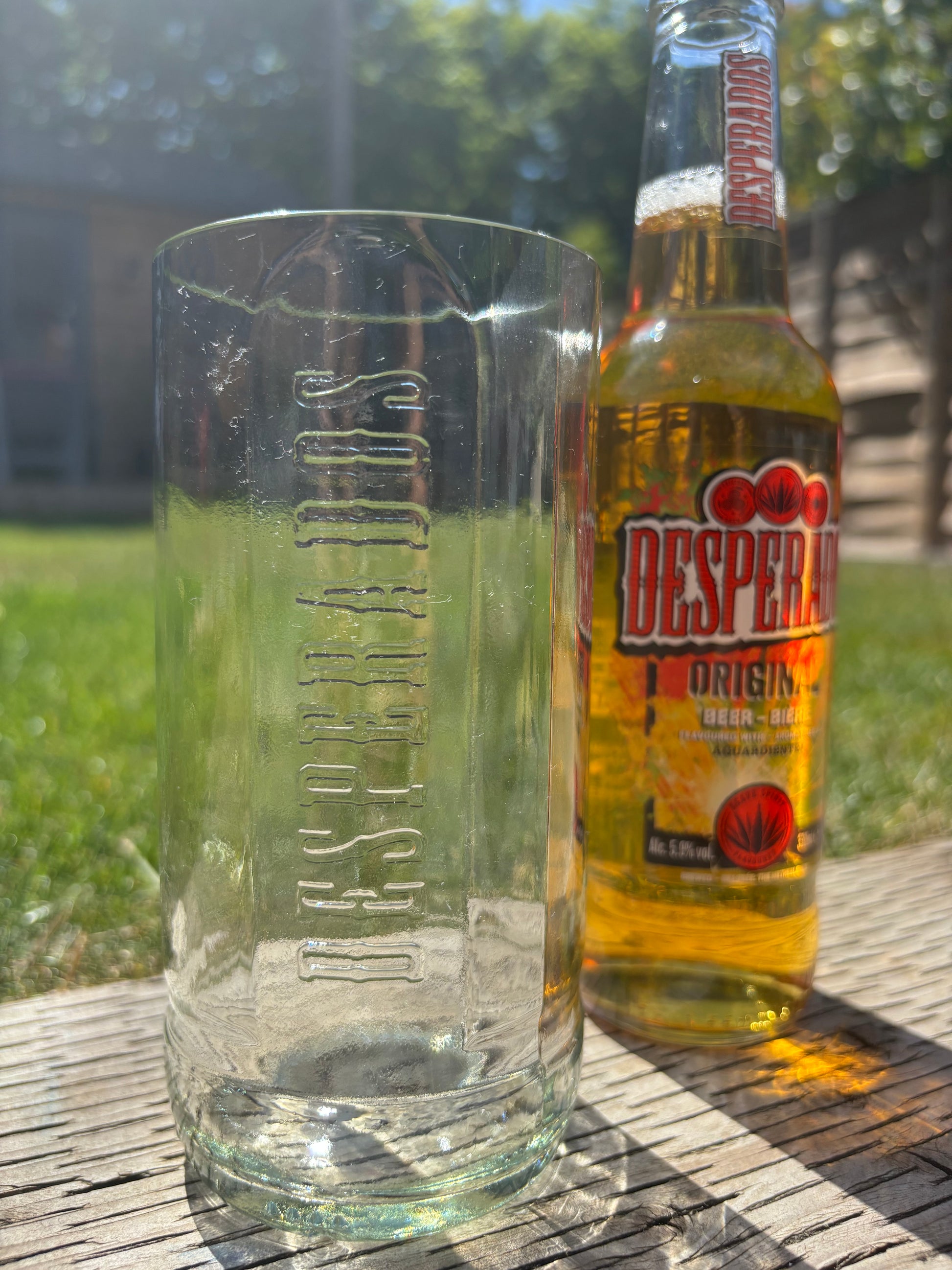 Desperados tumbler glasses. Handcrafted from upcycled Desperados bottles.