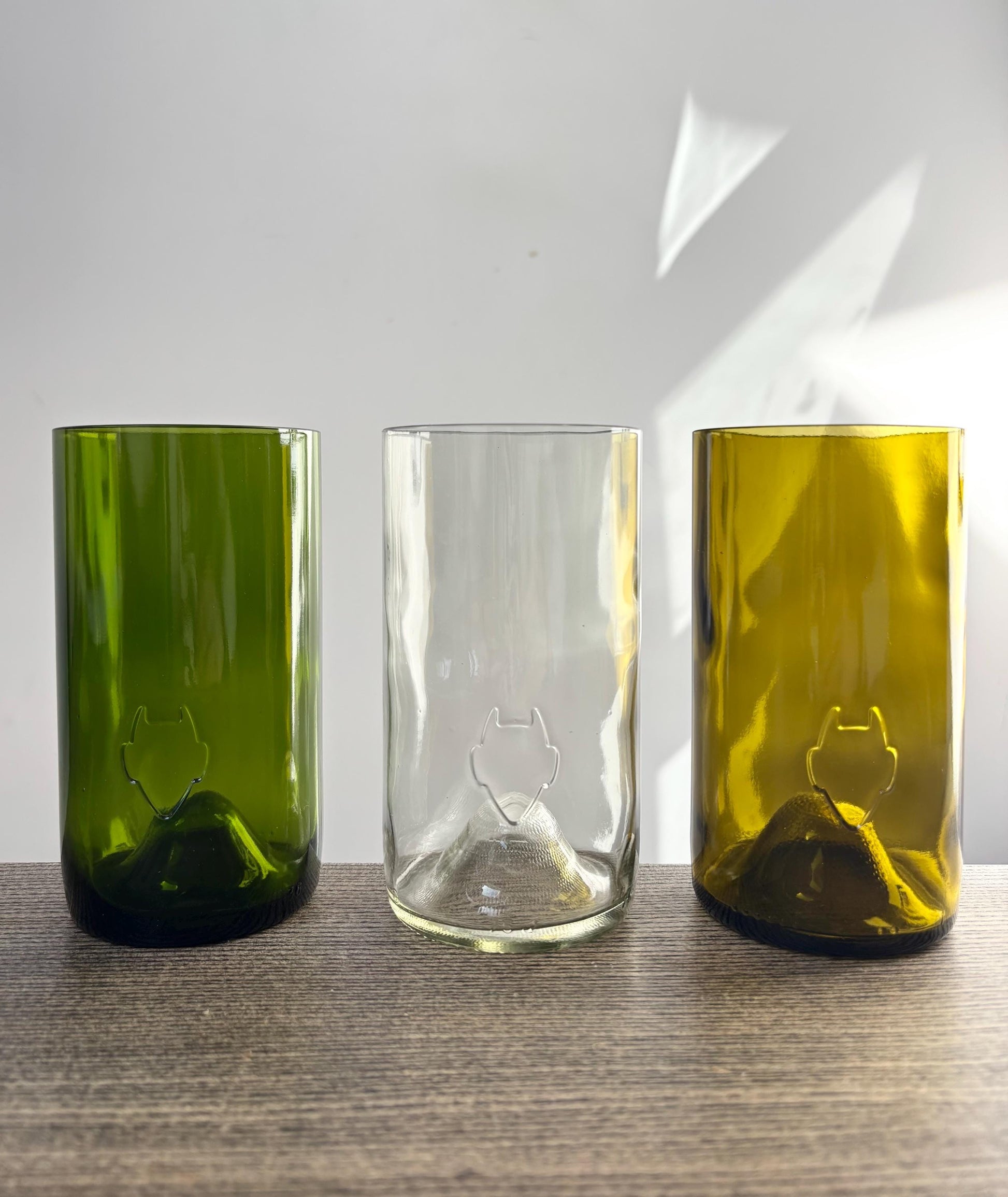Please be aware that whilst these glasses are lovingly handmade to a very high standard, they are made from recycled bottles and therefore every glass is unique and may come with very slight imperfections. Imperfections may include variations in the plugs and patterns on the bottom of the glasses.