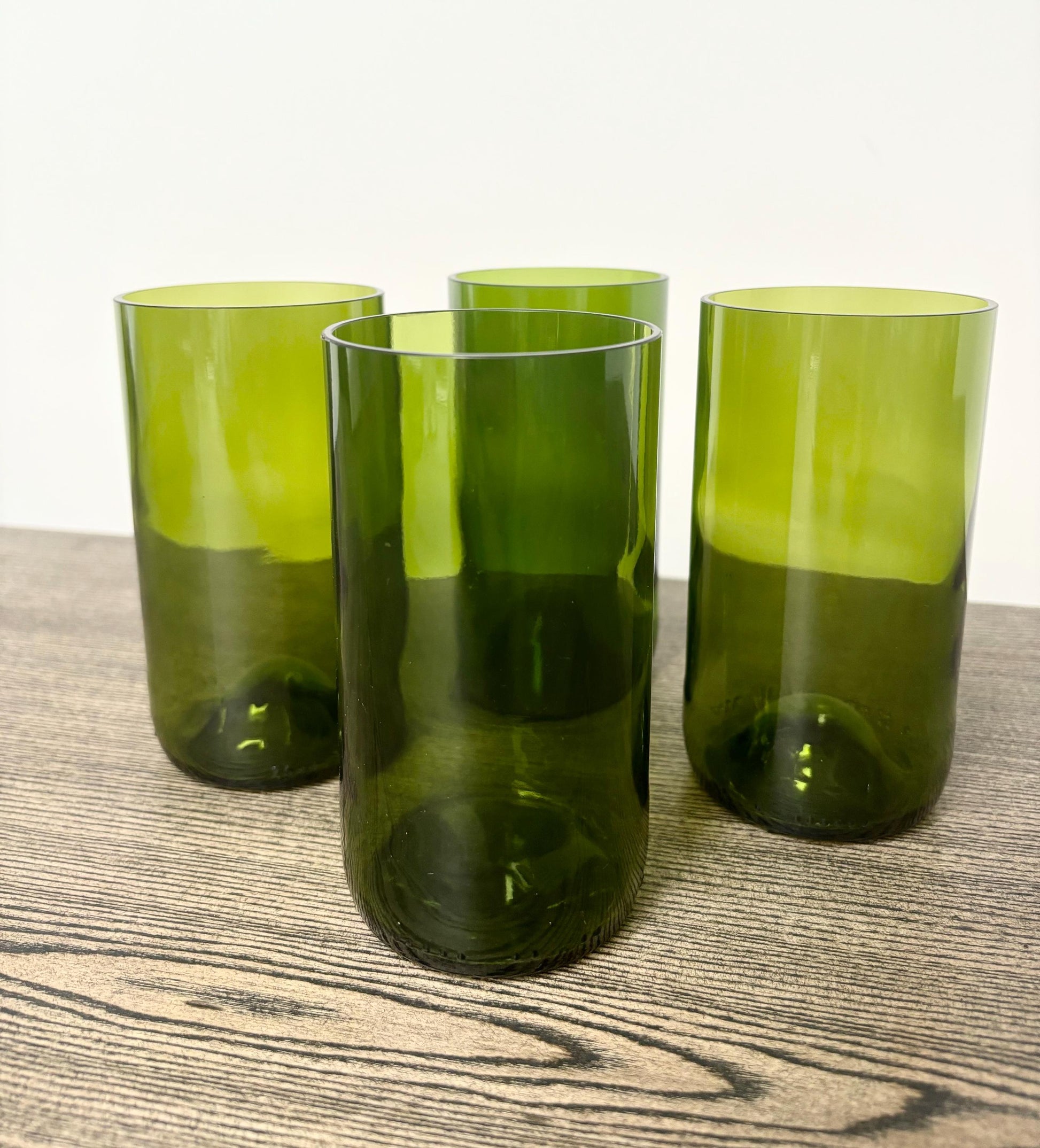 Olive green glass tumblers. Handcrafted from wine bottles that have been collected and upcycled in Suffolk, UK.