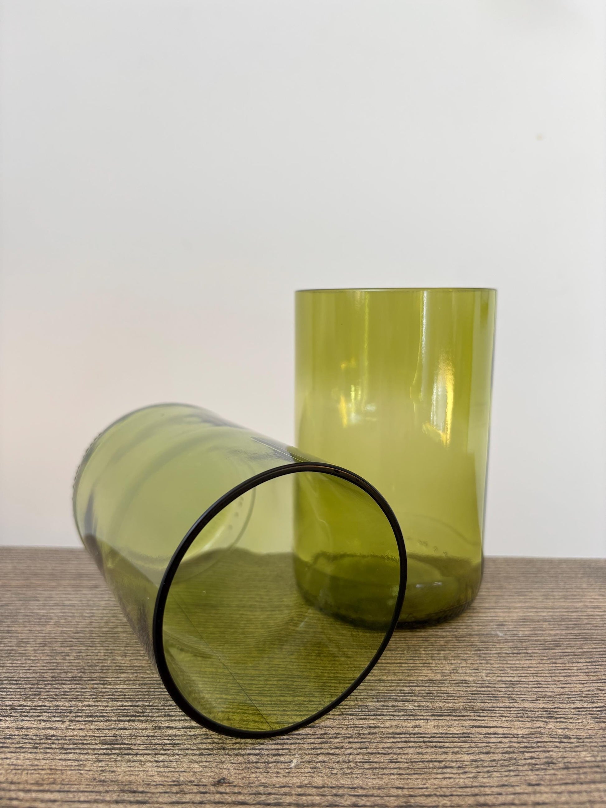 Short and wide olive glass tumblers. Just like our taller and slimmer version, these are handcrafted from wine bottles that have been collected and upcycled in Suffolk, UK.